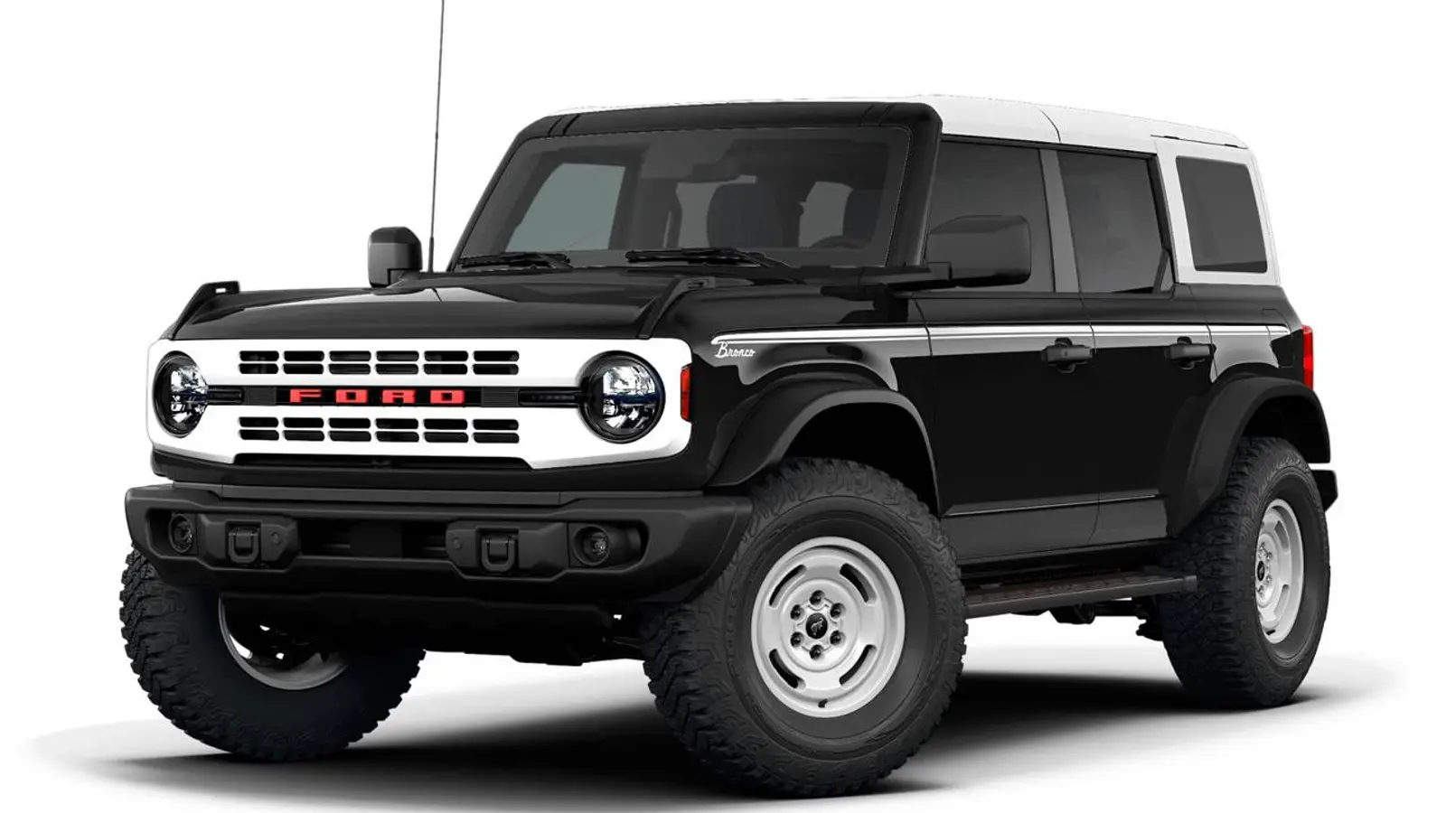 Das Modell wird zudem serienmäßig mit dem Sasquatch-Paket ausgeliefert. Dieses umfasst Allradantrieb, 35-Zoll-Geländereifen, eine erhöhte Bodenfreiheit, Radhausverbreiterungen und Bilstein-Stoßdämpfer. Abgerundet wird das äußere Erscheinungsbild durch ein weißes Dach und klassische Grafiken mit dem Bronco-Logo.