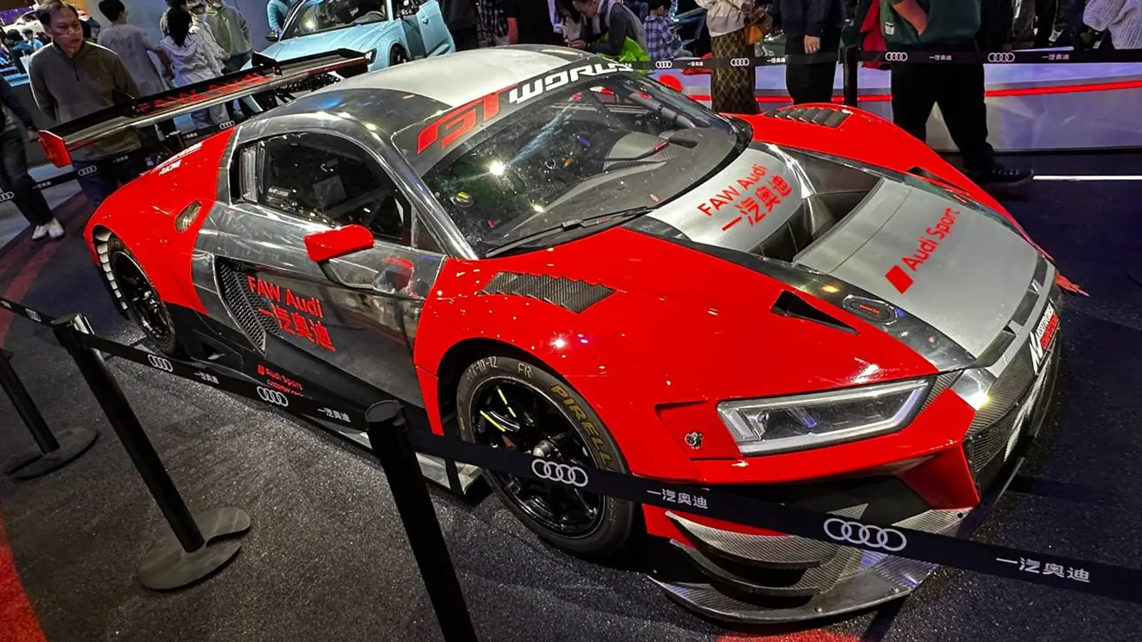 A guangzhoui autószalonon az Audi Sport egy pályahasználatra kihegyezett GT ügyfélversenyautót mutatott be, a márka jellegzetes piros–ezüst fényezésében, célkeresztben a professzionális mezőny. Az autó átfogó aerodinamikai csomagot visel: széles első splitter, motorháztető-nyílások, kiszélesített sárvédők és méretes, állítható hátsó szárny. A karosszéria nagy arányban használ karbon elemeket a tömeg csökkentése és a merevség növelése érdekében. Már első pillantásra egyértelmű, hogy itt nem a látvány az első, hanem a köridő.