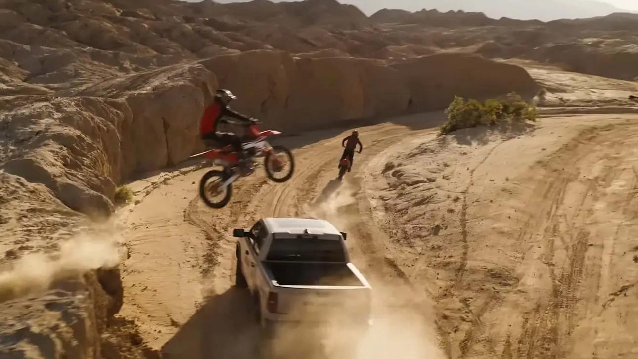 Дебют нового пикапа Ram RHO было не простой фотосессией в пустыне, а полноценной короткометражной лентой с участием нескольких грузовиков, известных гонщиков, голливудской звезды и генерального директора Ram Тима Кунискиса, который продемонстрировал свои актерские таланты в роли «босса». В съемках также участвовали несколько мотоциклов, один из которых, как оказалось, содержал скрытое послание о будущем мощном пикапе Ram.