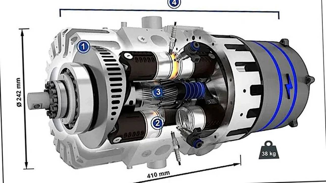 Этот двигатель не имеет привычной головки блока цилиндров, распредвала и коленвала, что делает его на 55% компактнее и легче стандартных ДВС. При весе всего 38 кг он развивает 120 л.с. и способен работать на бензине или водороде, что делает его потенциально интересным для автомобилей с водородным двигателем внутреннего сгорания.