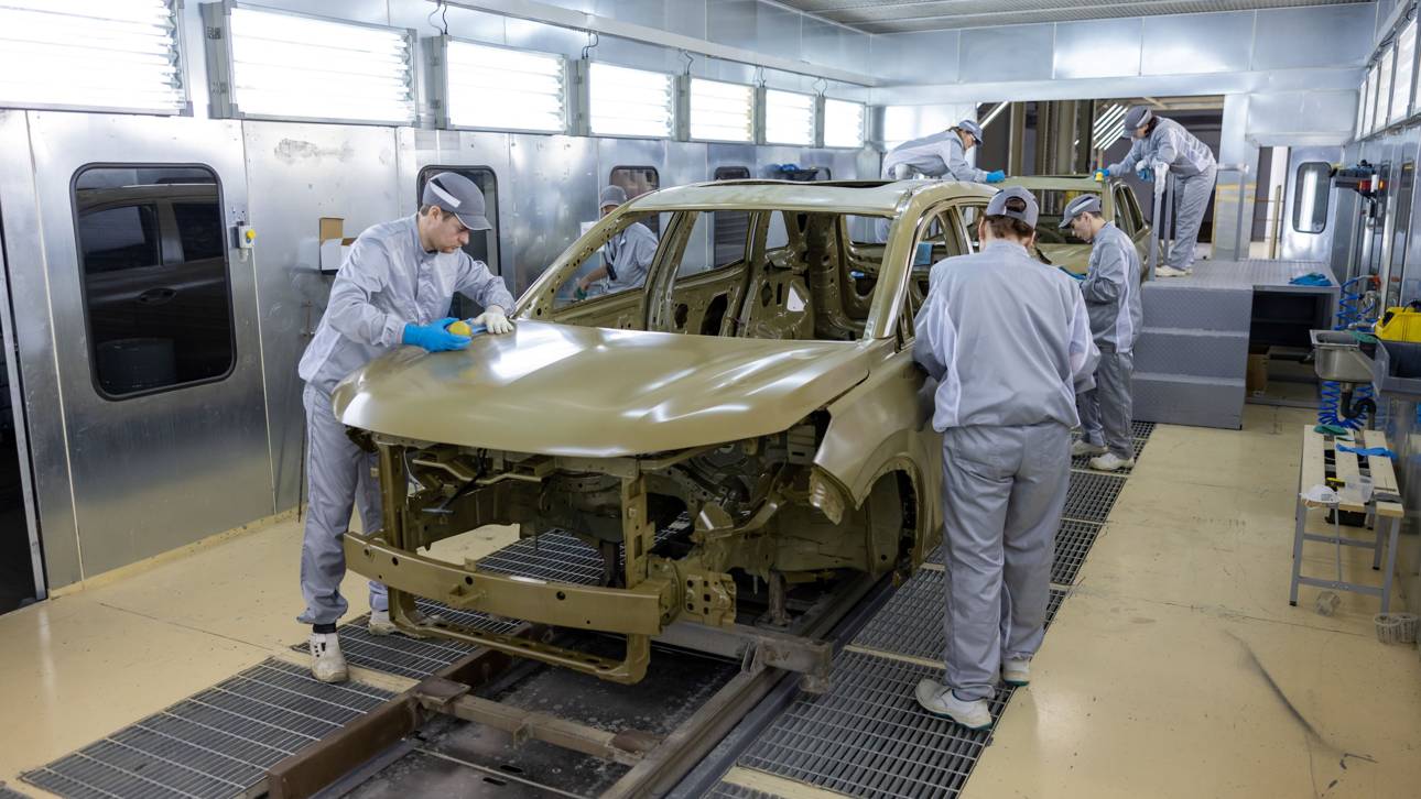 Окрасочный цех оснащён шестью роботами, работающими 24/7, а в начале 2026 года система будет расширена до 13 установок — с возможностью нанесения шумовиброгасящих материалов и 2-компонентных ЛКП. Завод использует российские краски, грунты и расходники, прошедшие заводские тесты.