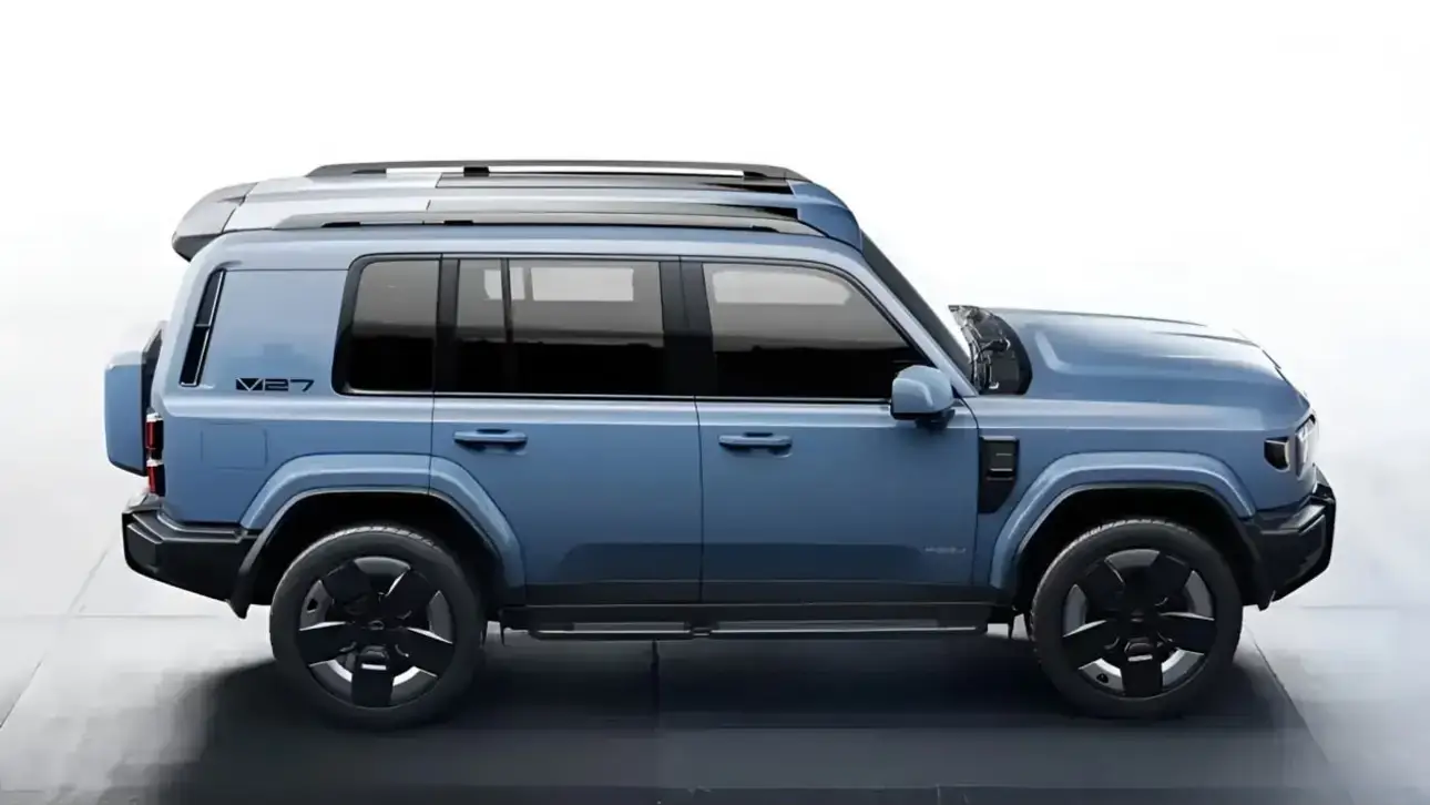 Внешне V27 выполнен в классическом внедорожном стиле: массивный бампер, контрастная решётка, вертикальная светотехника и боковая дверь багажника с навесным запасным колесом. Габариты составляют 4909 (5055) x 1976 x 1894 мм при колёсной базе 2910 мм. В салоне — Т-образная архитектура панели, физические клавиши управления и чип Qualcomm 8295P для мультимедиа.