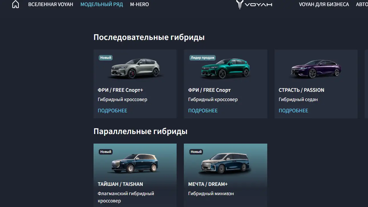 На российском сайте бренда Voyah появились адаптированные названия моделей. Теперь гибридный минивэн Dream обозначается как «Мечта», а седан Passion получил название «Страсть». При этом внедорожник M-Hero остался со старым названием.