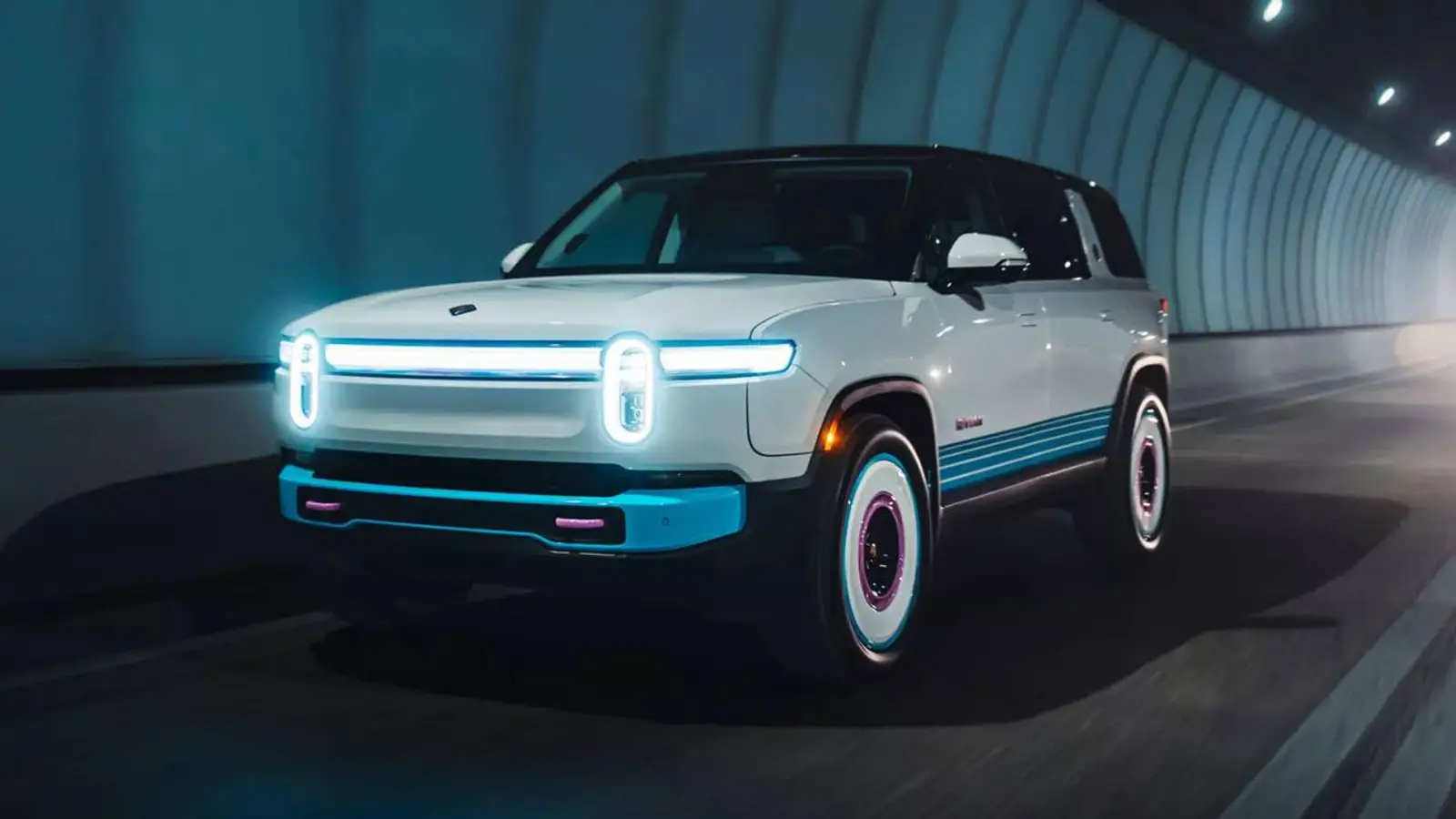 SUV-ul electric poartă o caroserie albă cu accente negre, completată de dungi laterale albastre și turcoaz. Cârligele de remorcare roz și un detaliu turcoaz pe bara față întregesc tema. Tonurile vii se regăsesc și pe jante, unde se amestecă elemente negre, roz, albe și turcoaz; paleta respiră Miami fără rezerve și transformă R1S într-o carte poștală pe roți din acea perioadă.